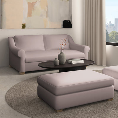 Perfect your seating arrangement with the Thompson Ottoman. The narrow frame and lean, tapered wooden feet evoke an elegance that is pared down to its essentials.